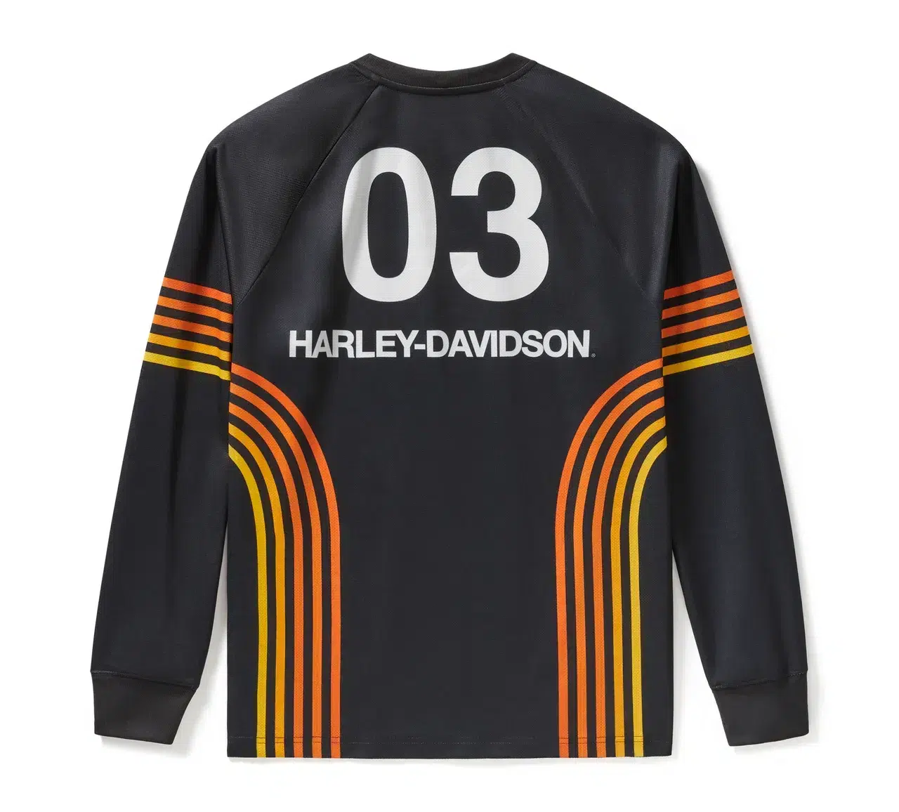 Da la vuelta de honor con estilo en nuestro H-D® TECH Racing Jersey. Fabricado con malla de poliéster estructurada en forma de panal para una sensación transpirable y ligera que absorbe la humedad. Los gráficos personalizados en toda la prenda le dan a esta camiseta de manga larga para hombre un aspecto colorido y contemporáneo que rinde homenaje a nuestra exitosa tradición en las competiciones de flat track.