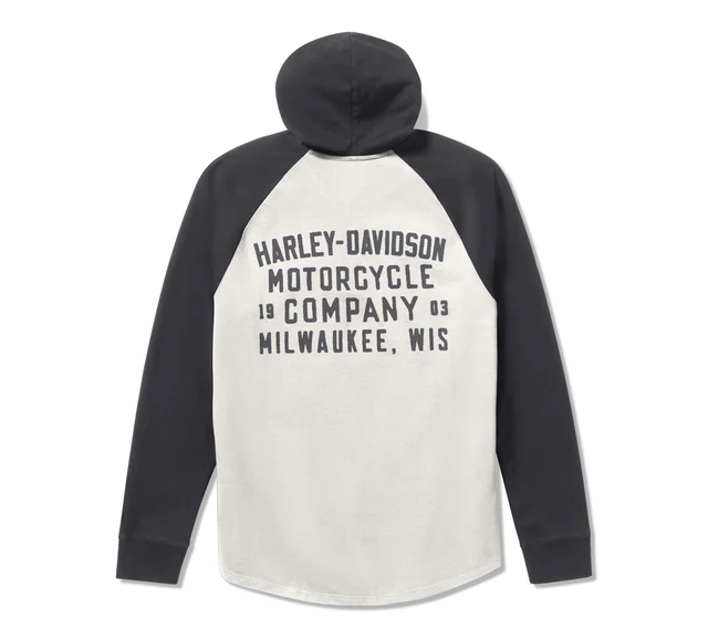 El estilo motorista clásico y retro llega a la HDMC Raglan Henley with Hood. Está confeccionada en jersey de algodón grueso, resistente y transpirable, lavado para conseguir una mayor suavidad y un aspecto desgastado. Esta camiseta Henley de manga larga para hombre cuenta con una tapeta de tres botones, mangas raglán en contraste y una capucha forrada de jersey. La parte delantera luce nuestro emblemático Bar & Shield, mientras que los gráficos traseros se inspiran en la ropa de carreras de nuestros archivos.